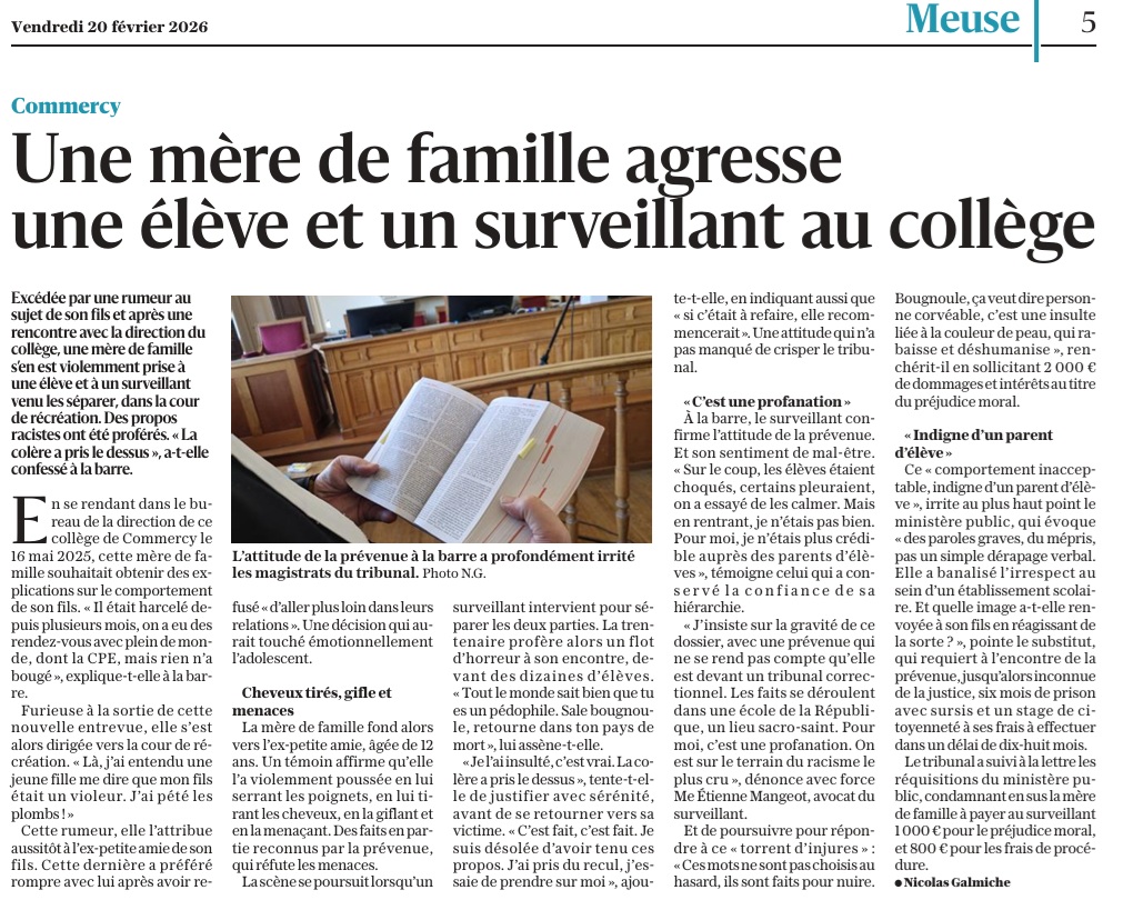 Une mère de famille agresse une élève et un surveillant au collège Laisser un commentaire / Médias / Par Étienne Mangeot L’EST REPUBLICAIN, 20 février 2026